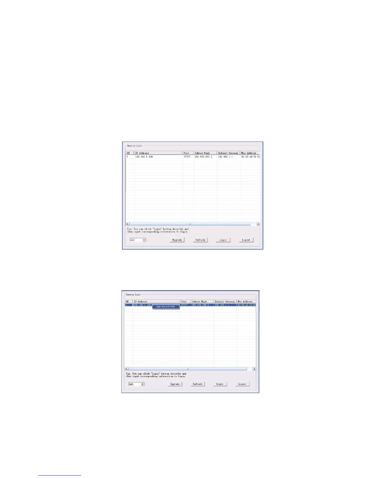 In the device list interface, you can view device IP address, port number, subnet mask, default