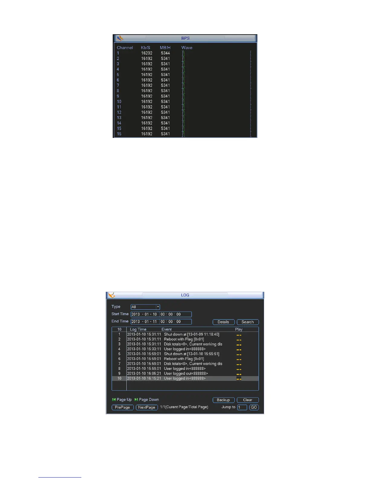log files. Please use page up/down button on the interface or the front panel to view more.