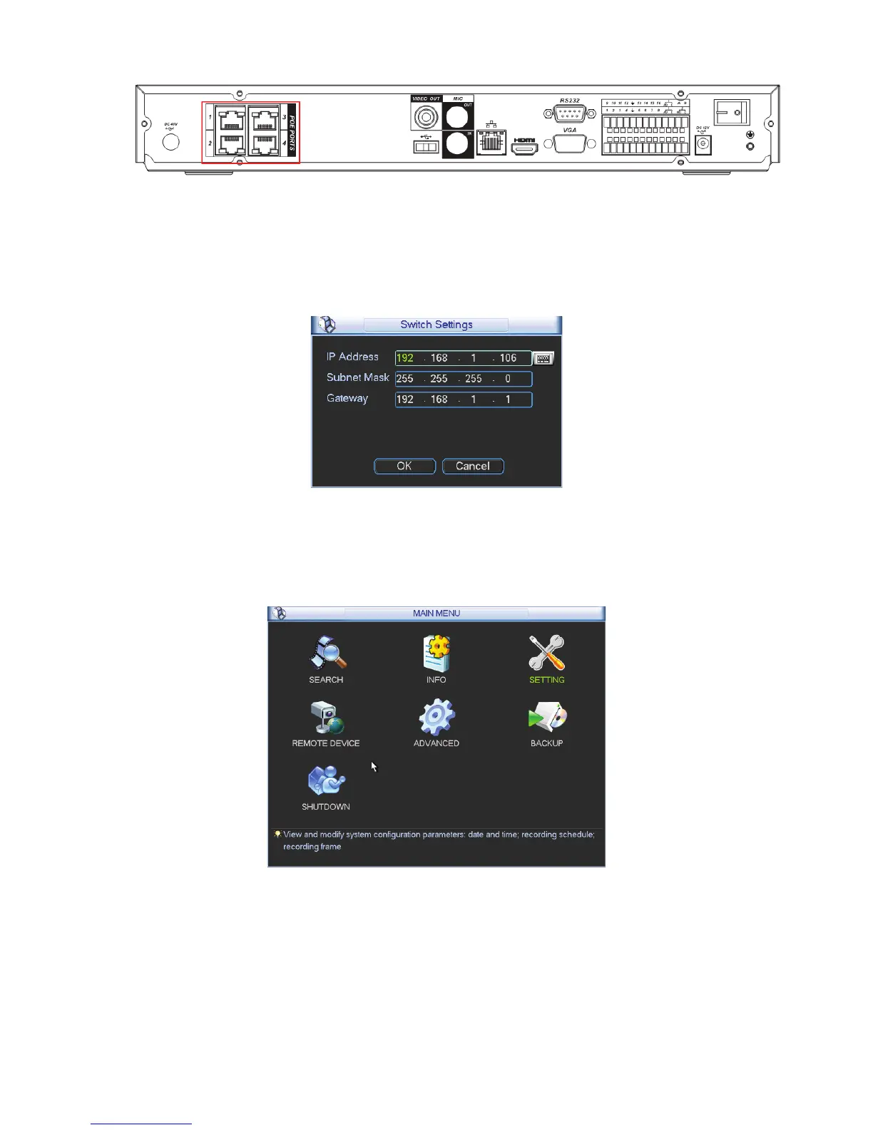 From Network->Network Server->Switch, you can set switch IP address, subnet mask, gateway