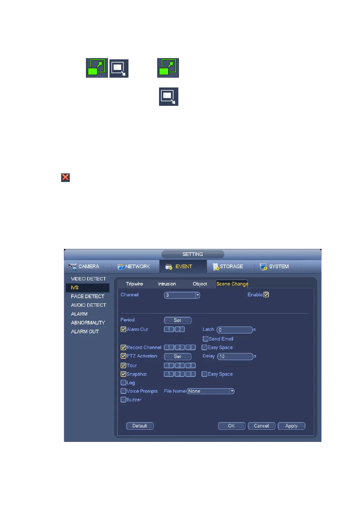 From main menu->Setting->Event->IVS->Scene change, the interface is shown as in Figure 4-108.