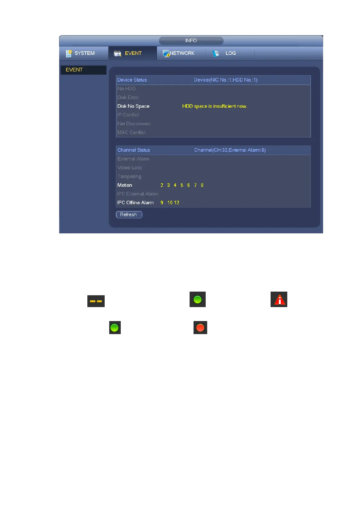 IPC status: : Front-end does not support. : Front-end supports. : There is alarm
