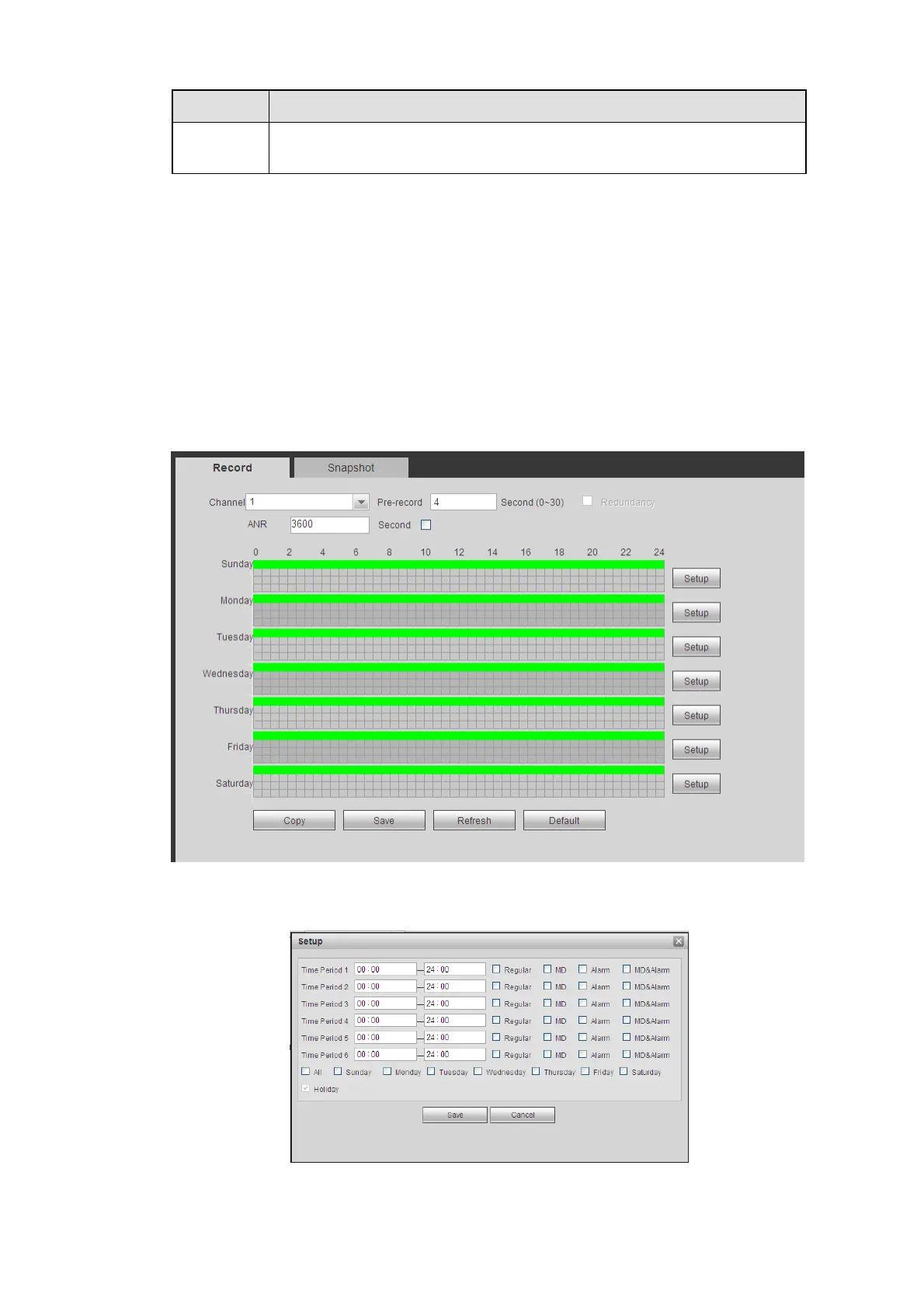 There are four record modes: general (auto), motion detect, alarm and MD&alarm. There are six periods