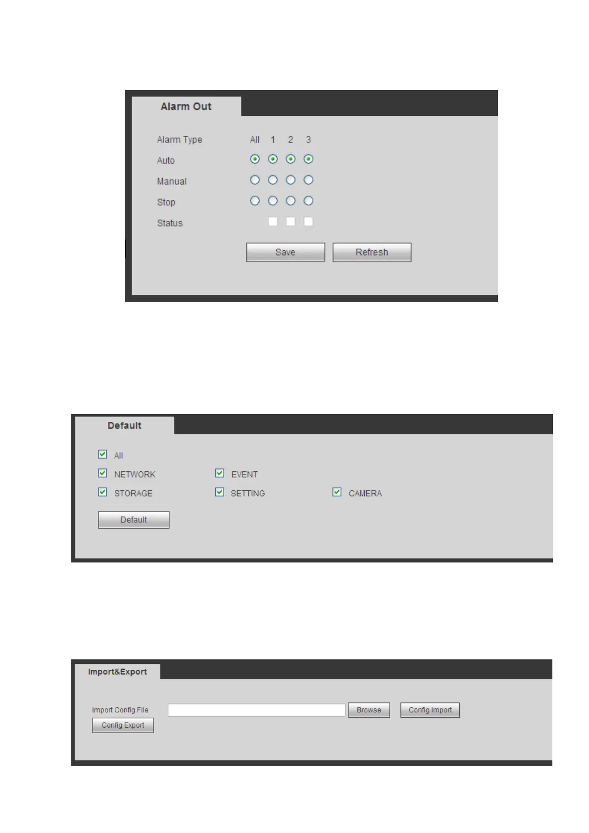 Here you can set alarm output mode: auto/manual/stop.
