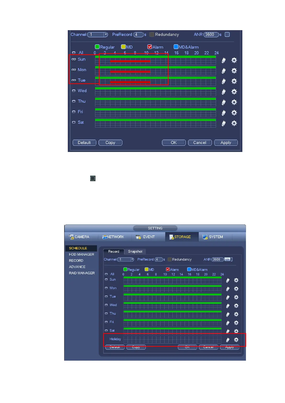for motion detection and red color stands for alarm recording. The white means the MD and alarm