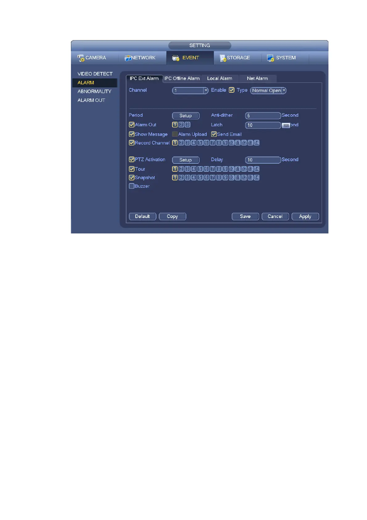 c) From Main menu->Setting->Event->Alarm, you can go to Figure 4-75 to set alarm parameter