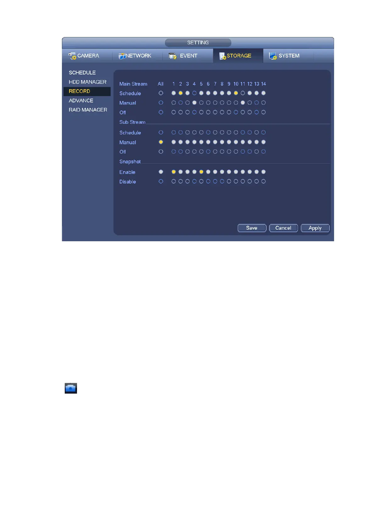 Manual: It has the highest priority. Enable corresponding channel to record no matter what period