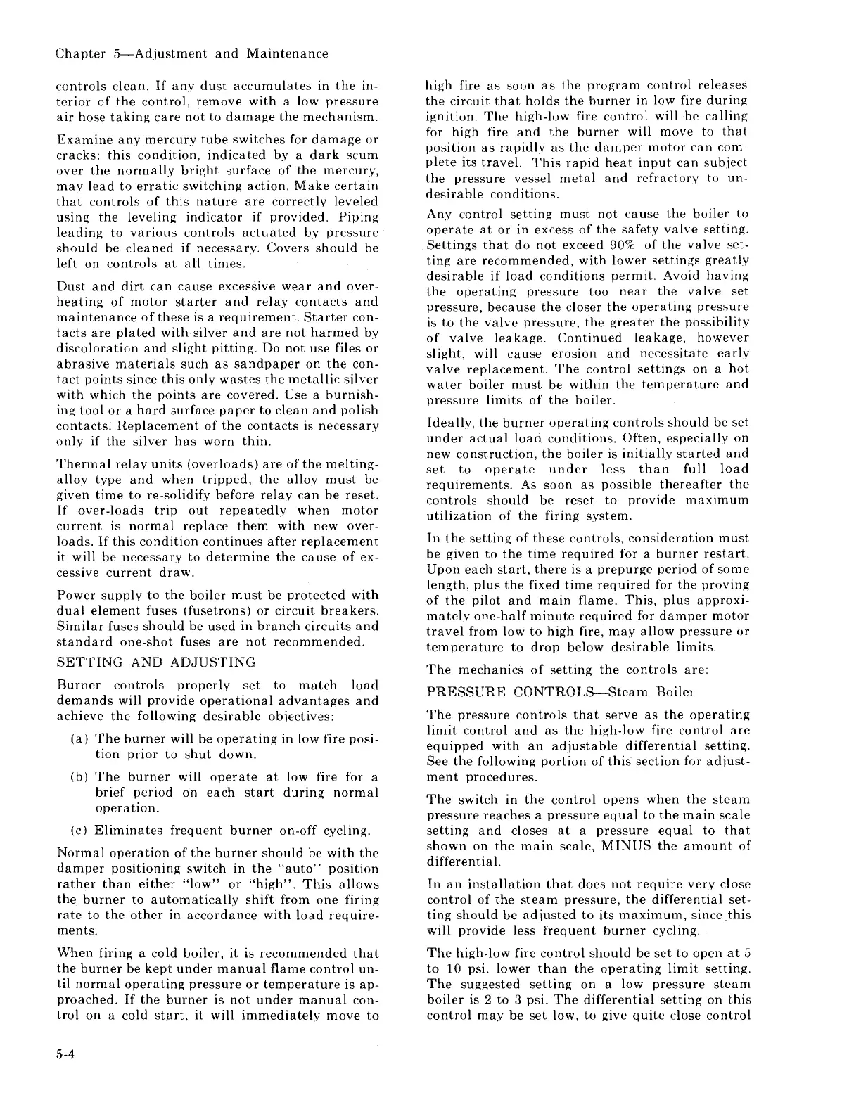 Cleaver-Brooks CBH 40 - Setting and Adjusting; PRESSURE CONTROLS-Steam Boiler