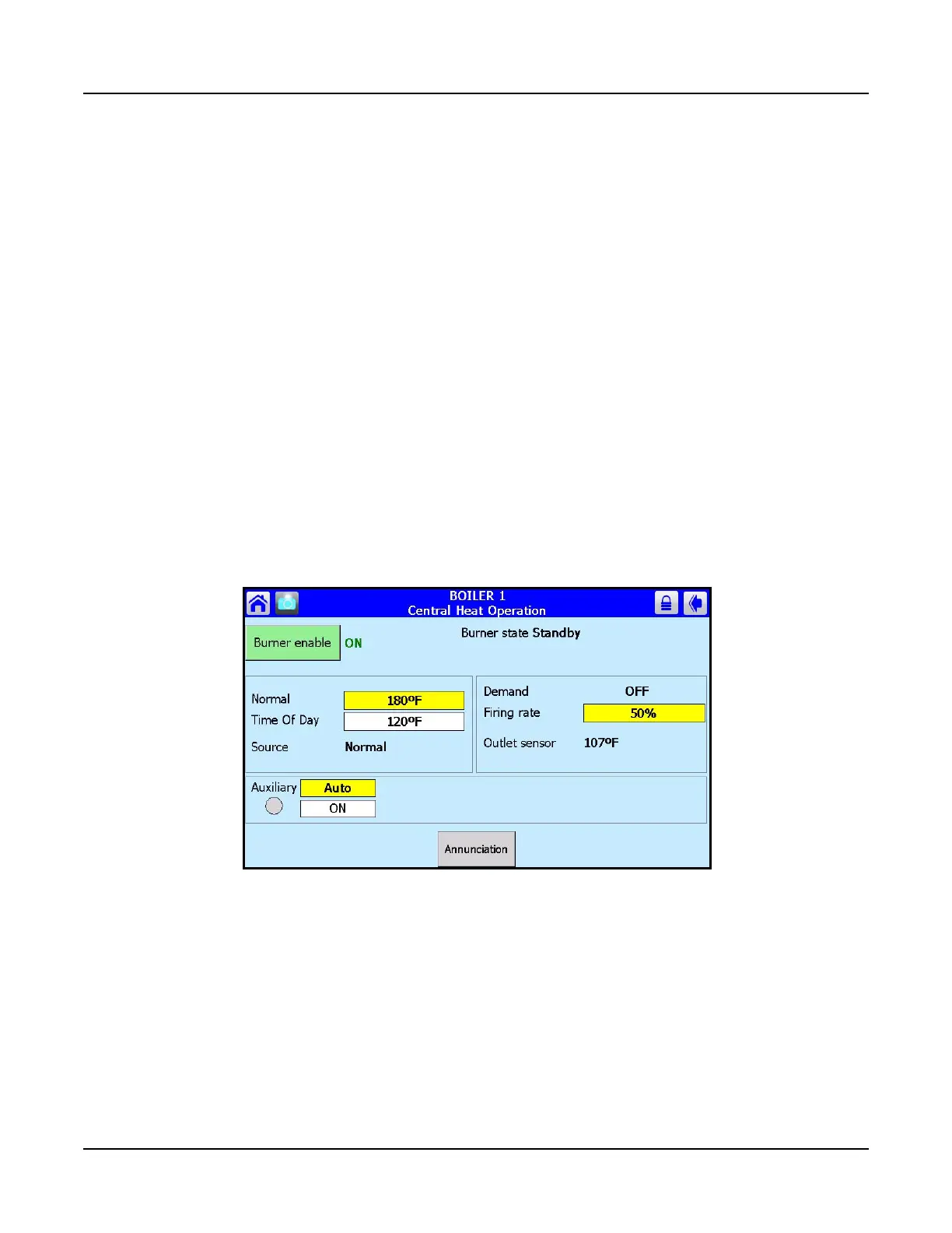 values. From this page the user can change setpoints, manually control the boiler’s firing rate, manually