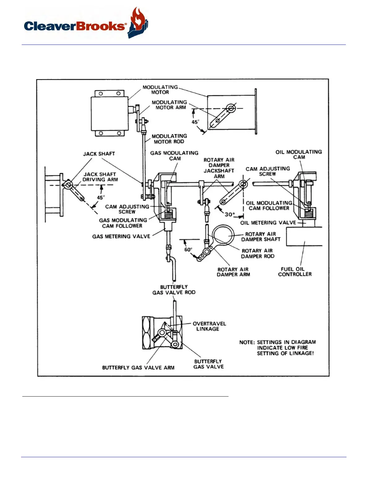 With the modulating motor in the low fire position, the arm on its shaft should be at an angle of 45º below the hor-