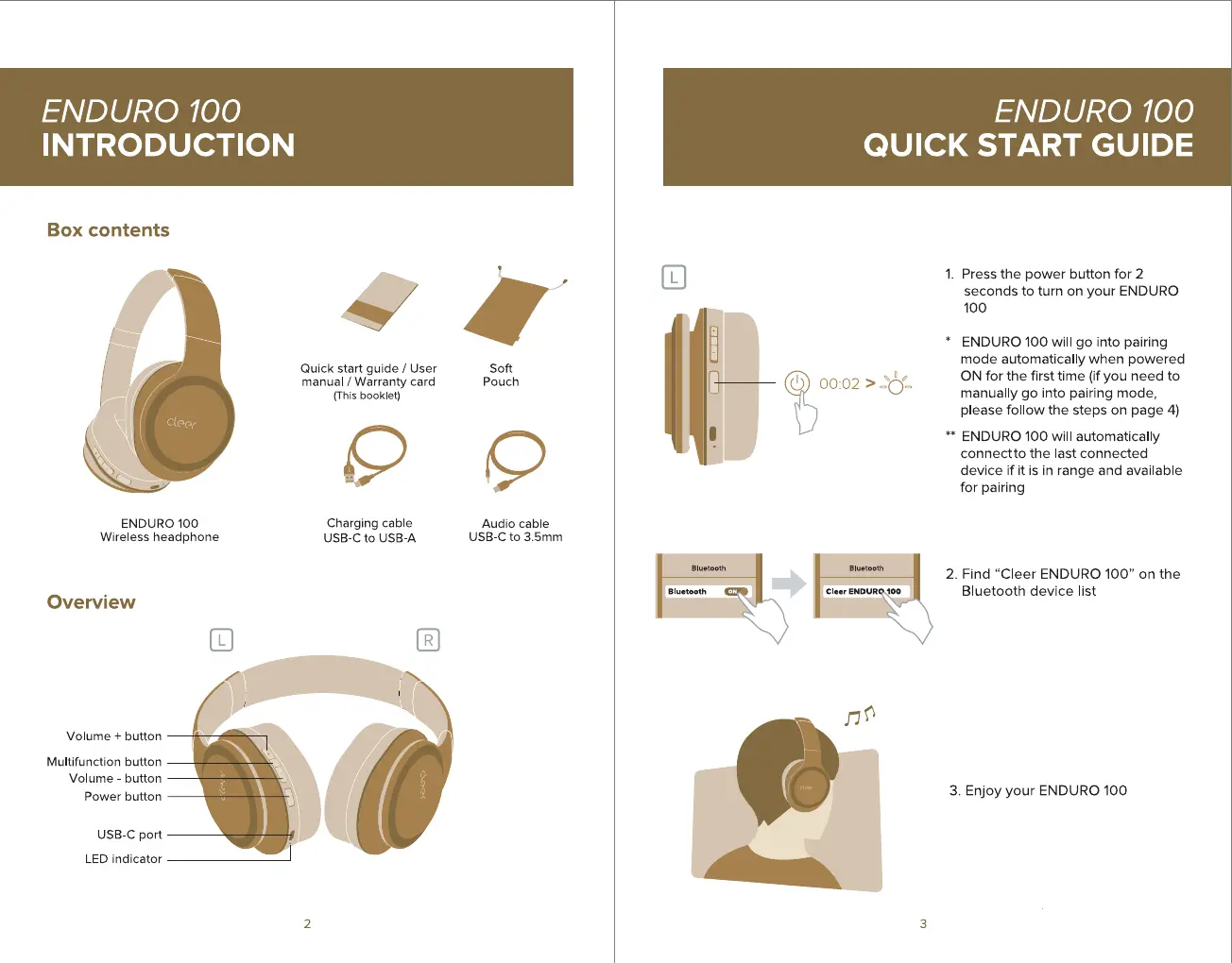 cleer ENDURO 100 - Enduro 100 Introduction; Box Contents; Product Overview; Enduro 100 Quick Start Guide