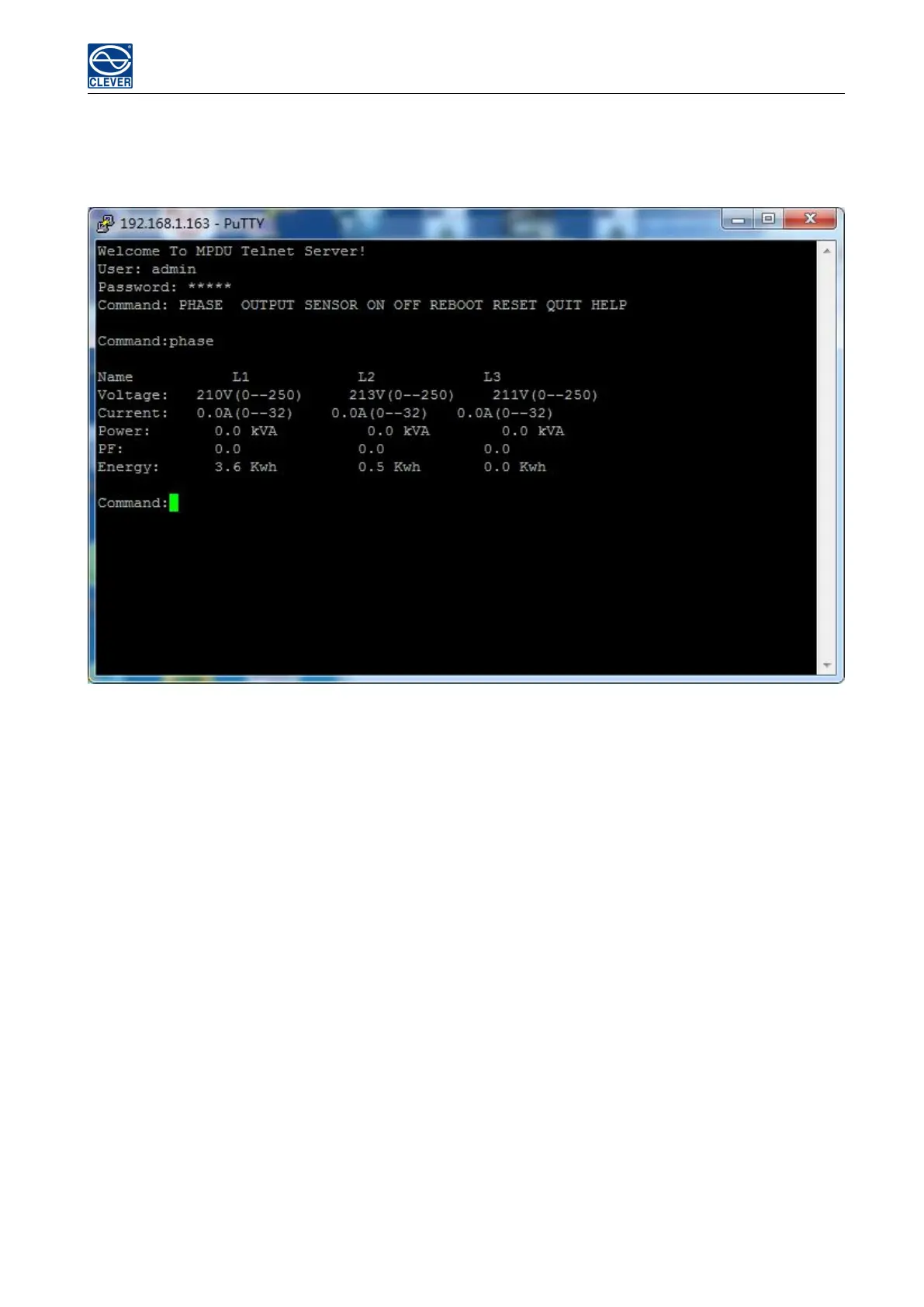 Use the PHASE command to view the power data including current, voltage, power, power factor, power