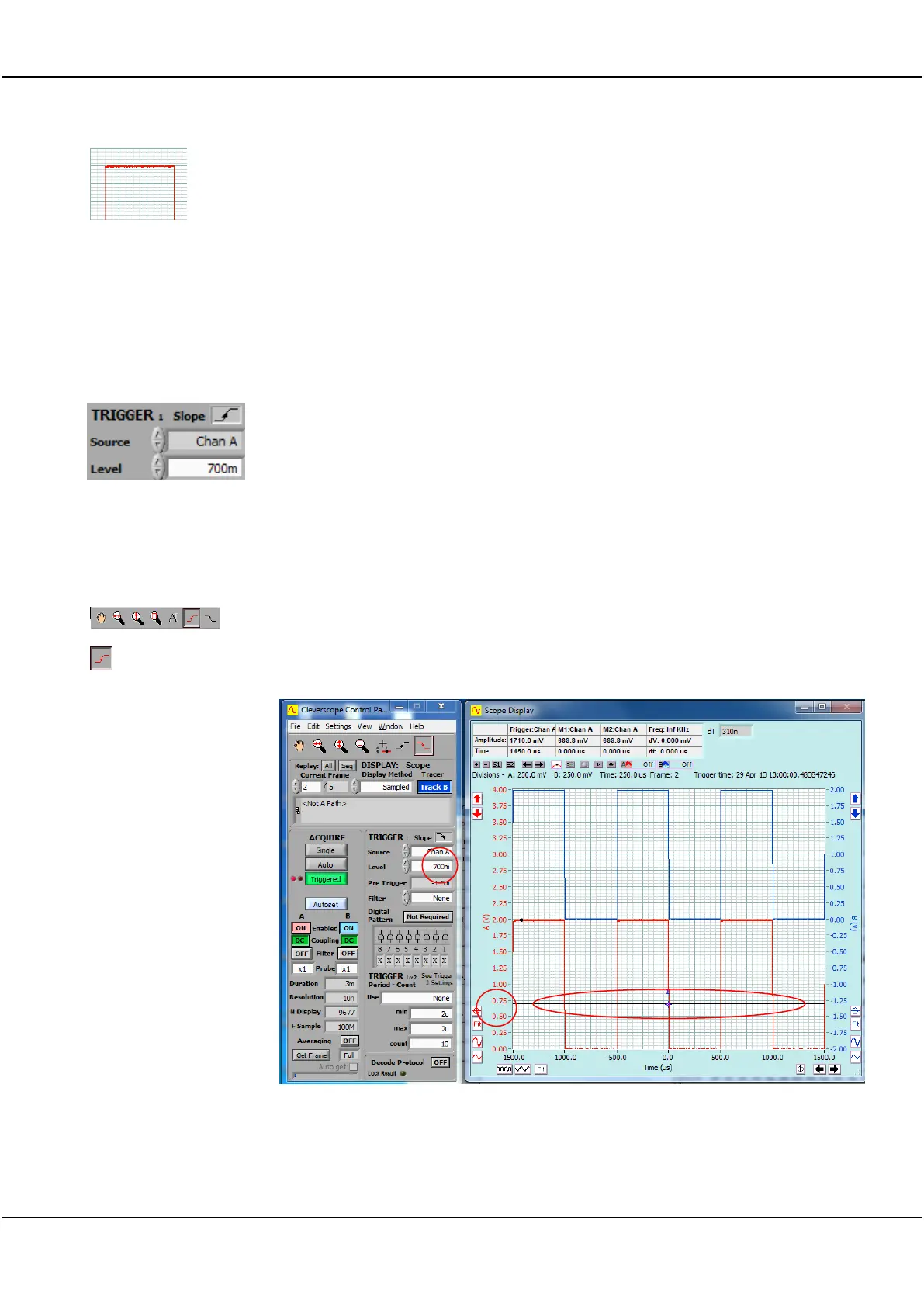 In the captures shown in the previous topics the Cleverscope has triggered on the falling edge. To change this