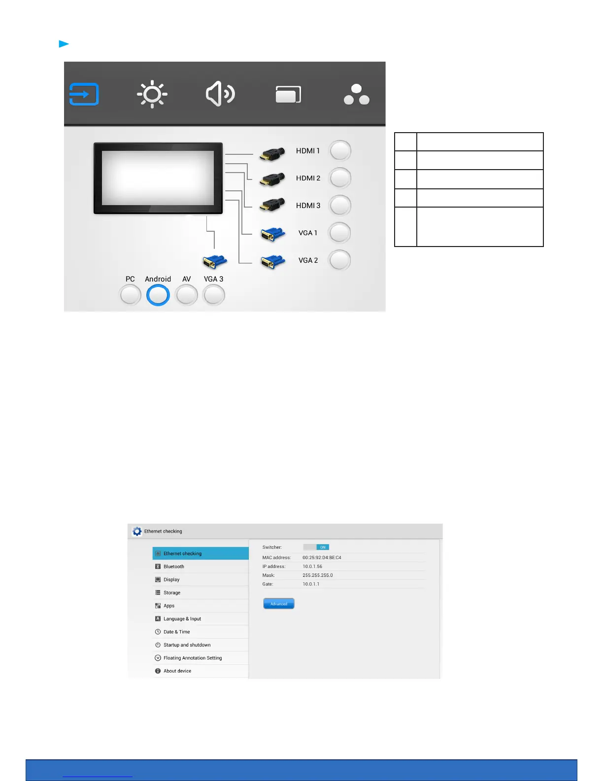 From the on screen menu you can select Inputs such as Android, IPC, HDMi and VGA.