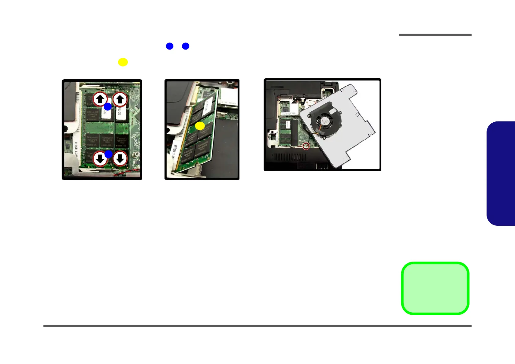 7. Gently push the two release latches ( & ) on the sides of the memory socket in the direction indicated by the