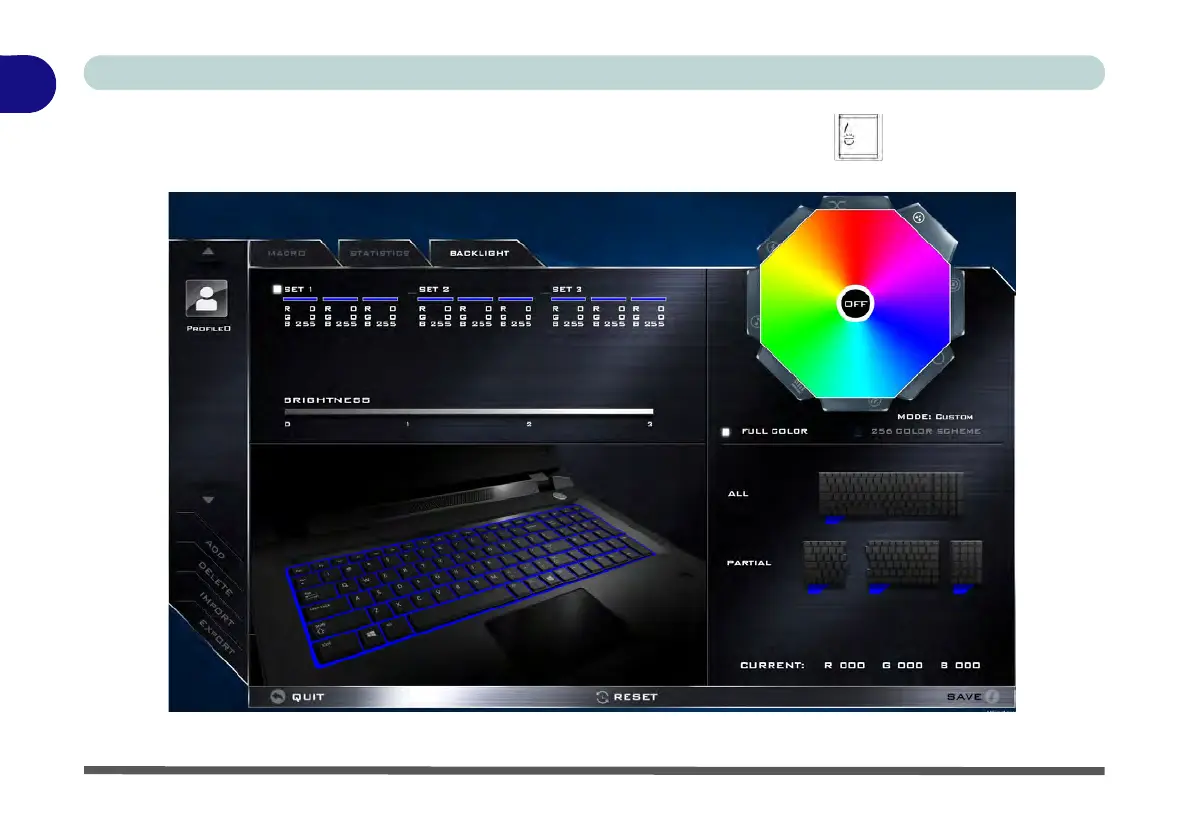 The Keyboard Backlight application can be accessed by pressing the Fn plus key (or by clicking the