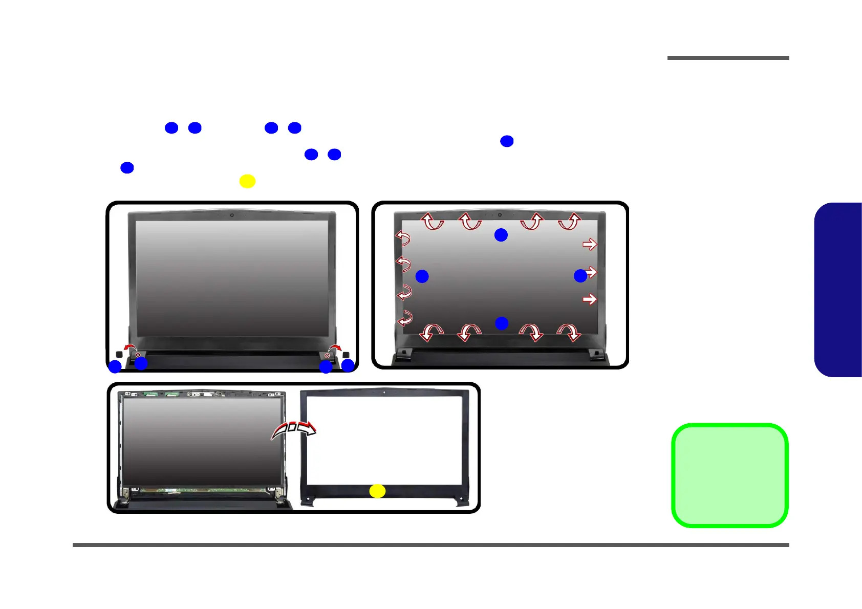 3. Run your fingers around the inner frame of the LCD panel to lift at the upper point as indicated by the arrows,