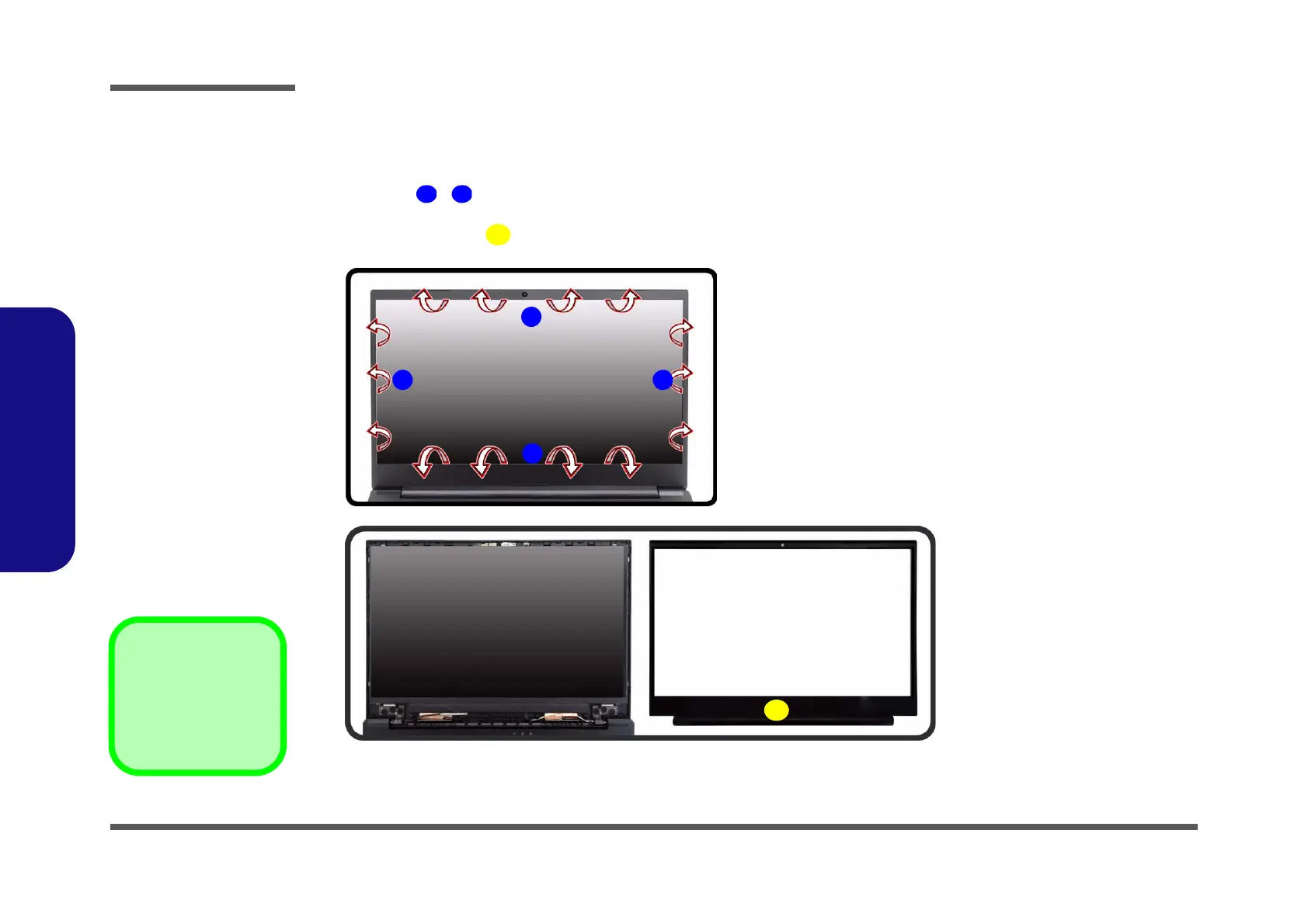 2. Lift up the inner frame and run your fingers around the inner frame of the LCD panel at the points as indicated by