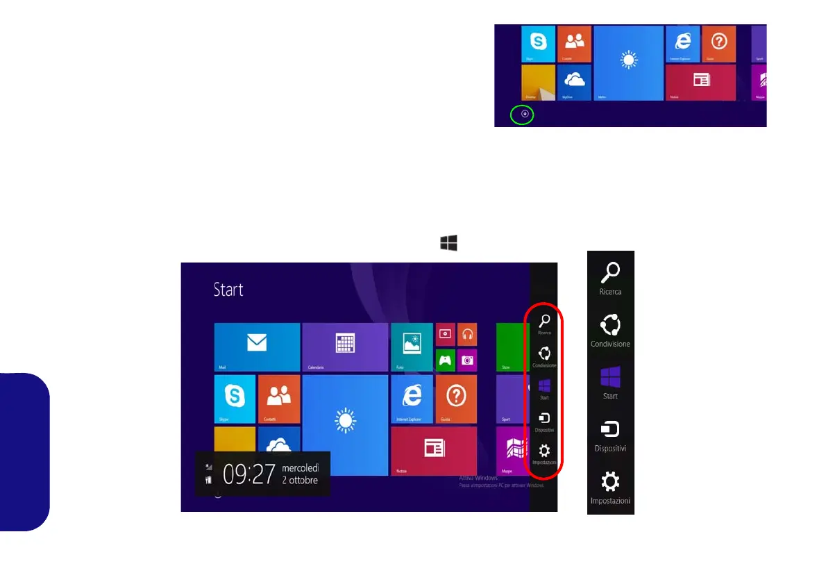 inferiore dello schermo, e quindi passare sopra a uno degli oggetti nella Charms Bar per attivarlo (quando è attiva la barra è