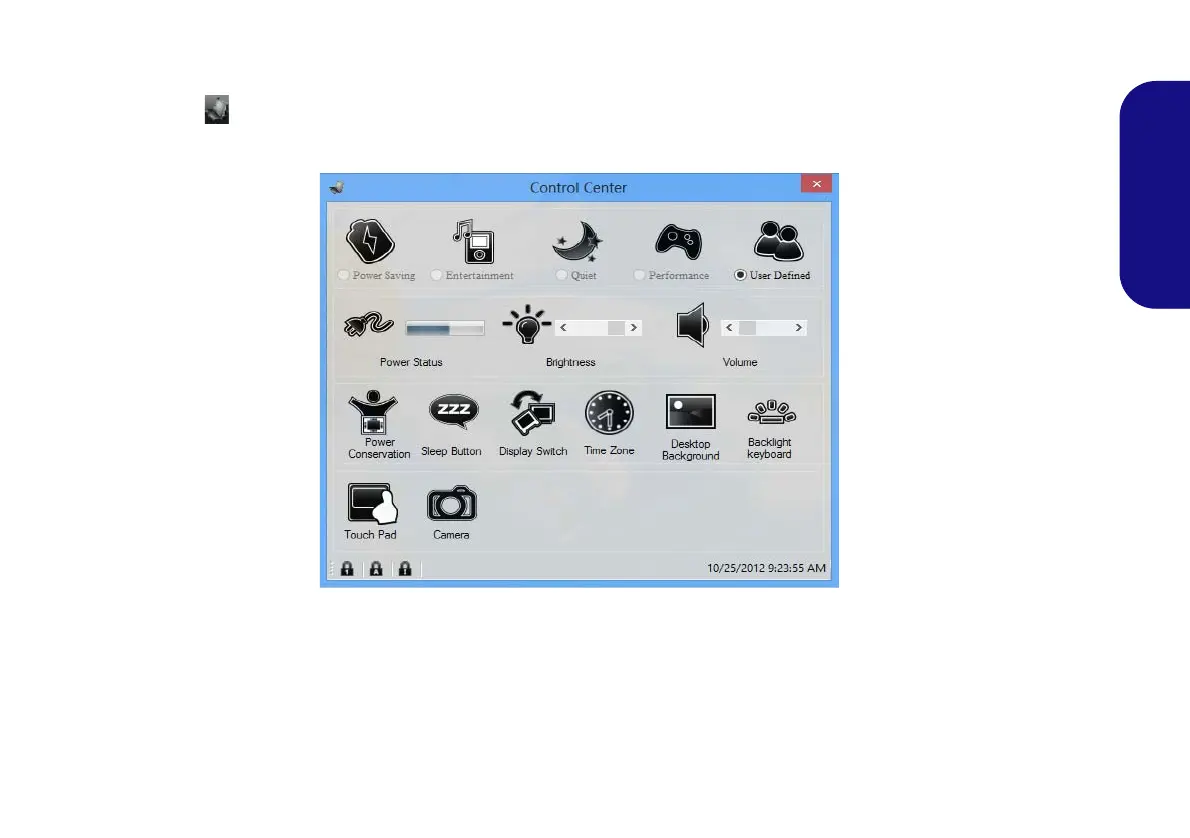 to adjust the slider for Brightness/Volume. Click on Display Switch/Time Zone/ Desktop Background to bring up