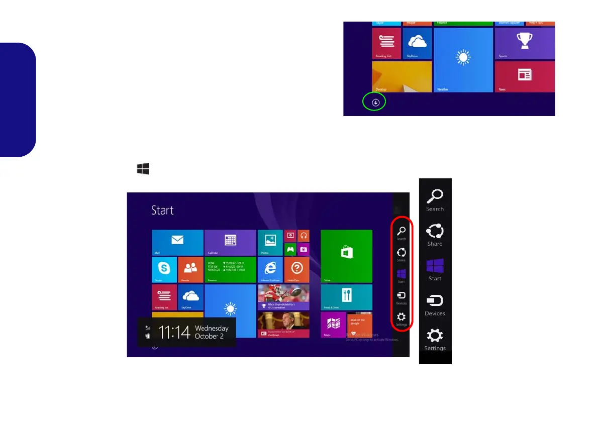 Settings menus. To access up the Charms Bar move the cursor to the upper or lower right corners of the screen, and