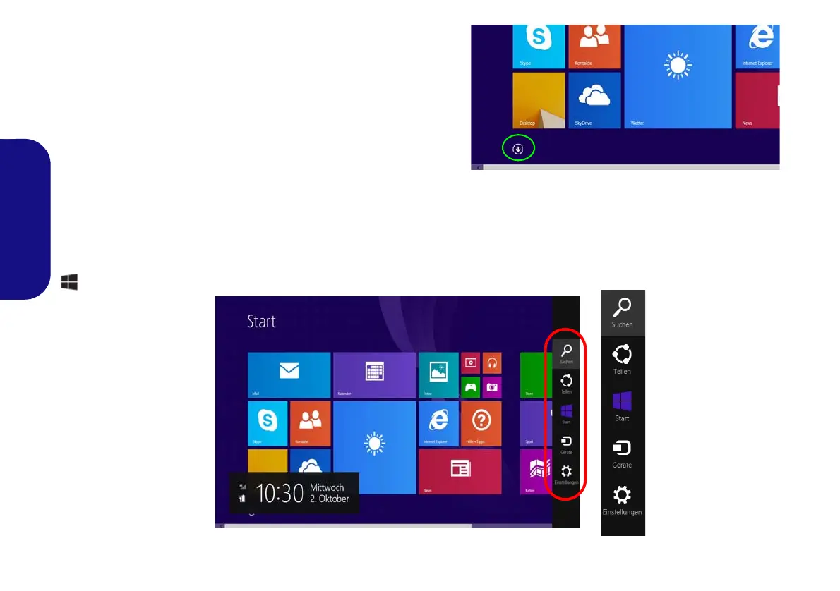 in die unteren rechten Ecken des Bildschirms und dann über den jeweiligen Eintrag in der Charms-Leiste, um diesen zu ak-