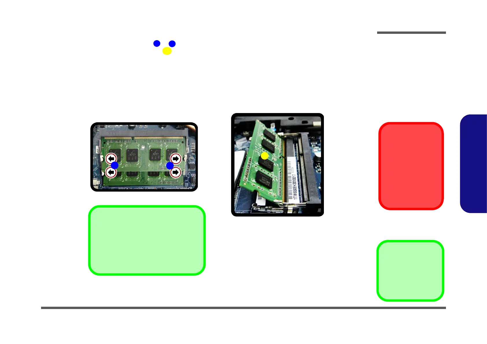 5. Gently pull the two release latches ( & ) on the sides of the memory socket in the direction indicated by the