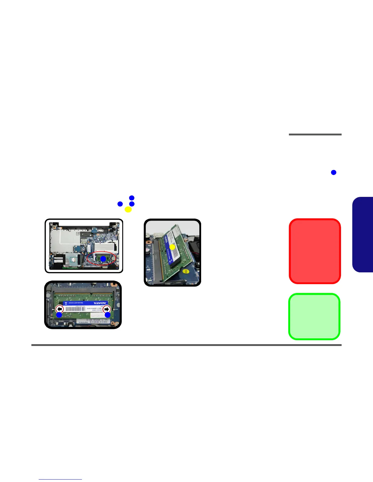 3. Gently pull the two release latches ( & ) on the sides of the memory socket in the direction indicated by the