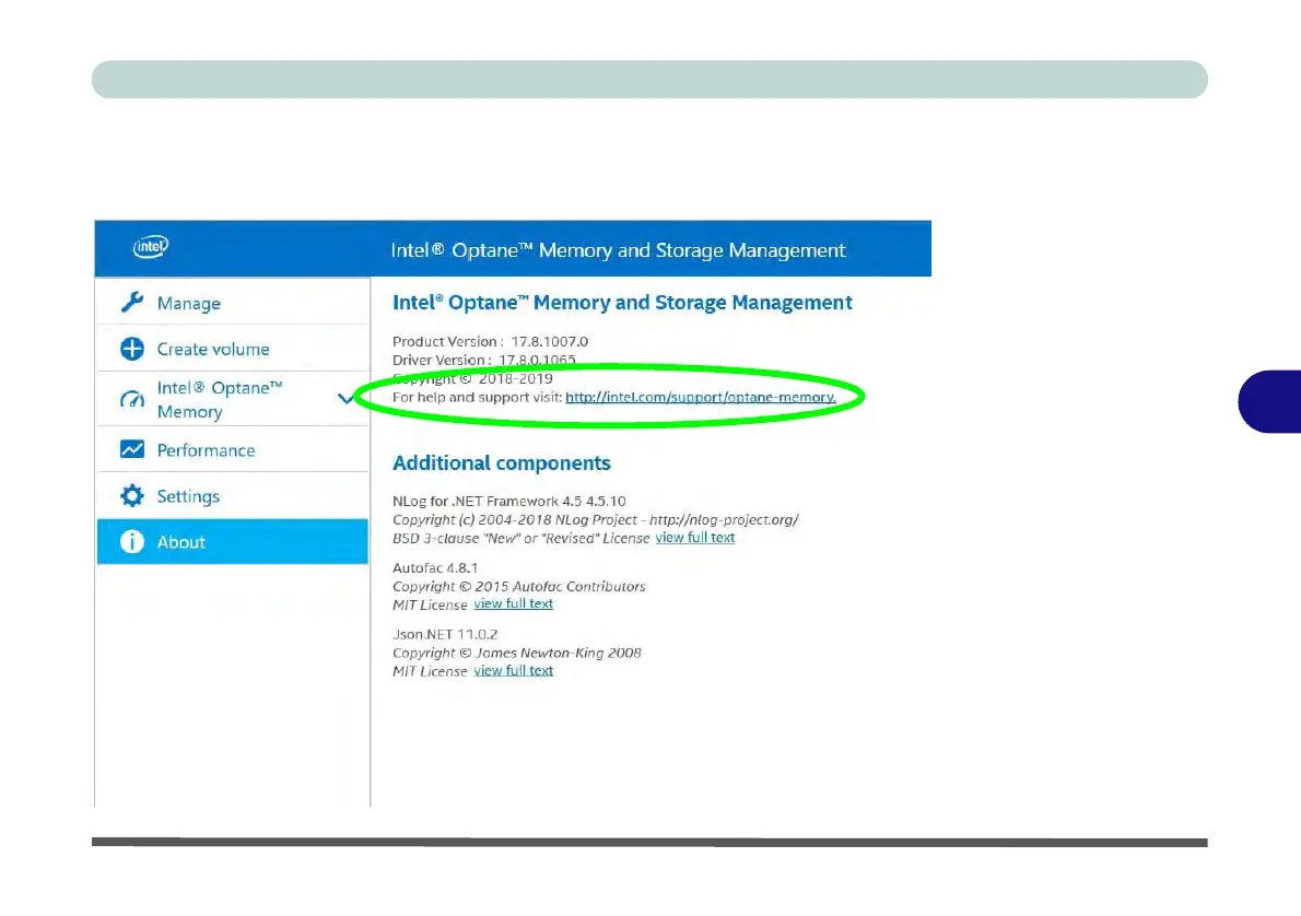 Click the link in For help and support ... in the About menu to go to the Intel sup-