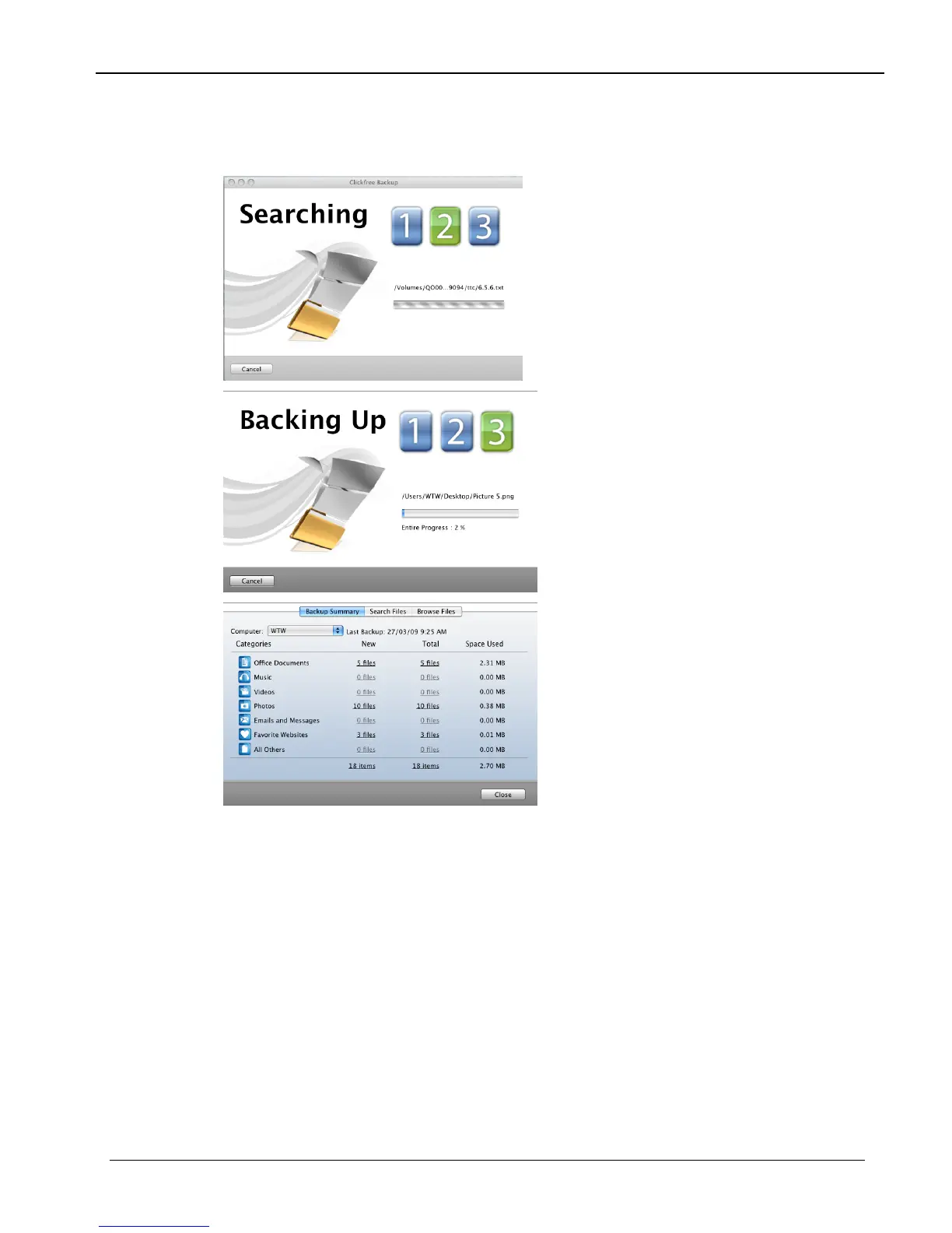 Clickfree displays some windows to show progress: