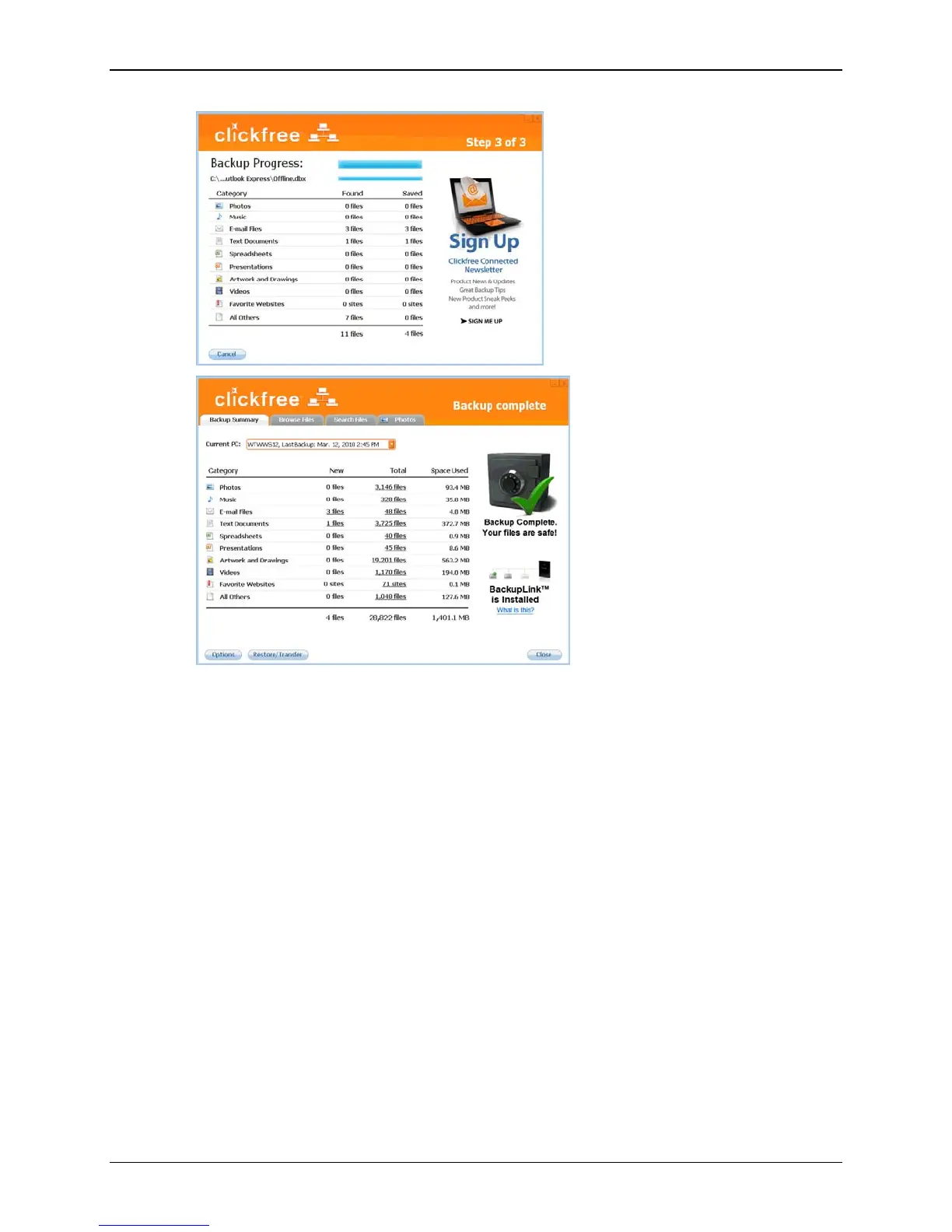 Backup Summary screen shows you how many files in each category were
