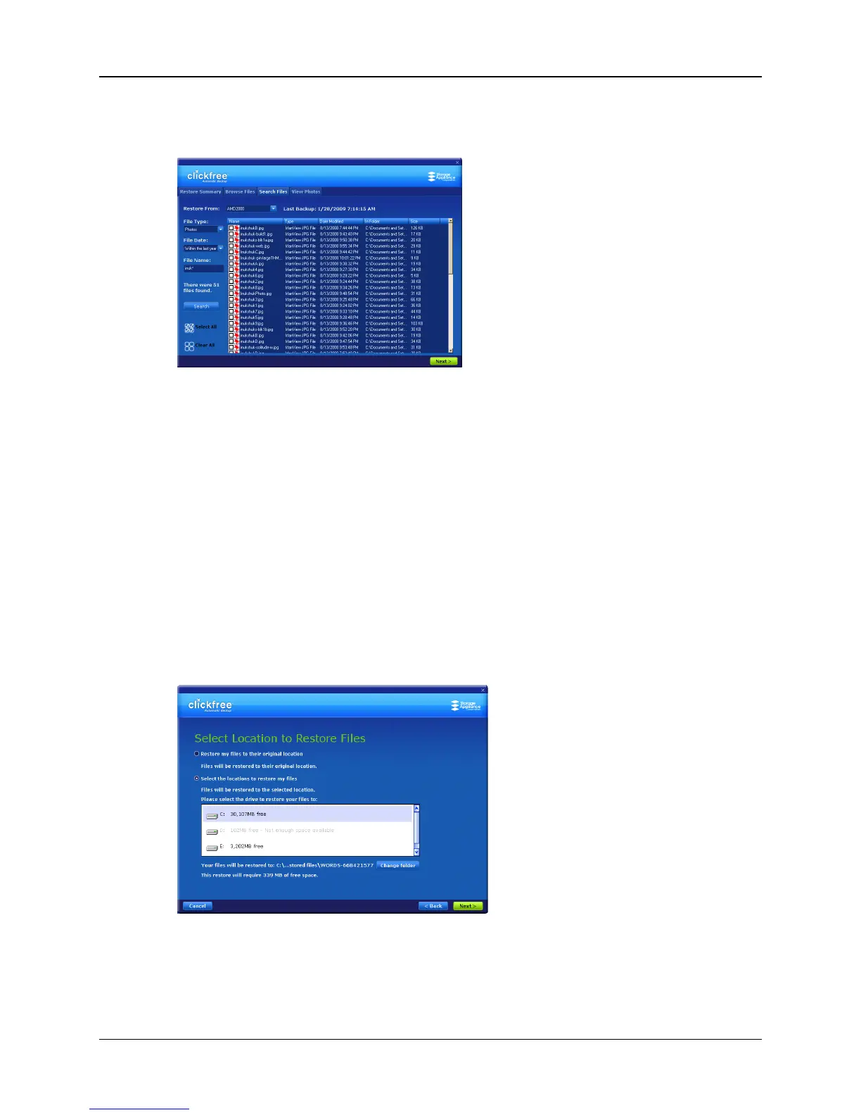 On the Select Location to Restore Files screen you can choose: