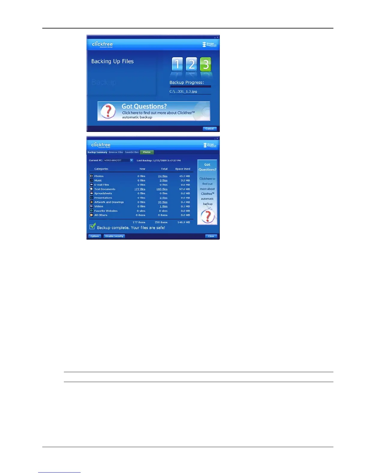 Backup Summary screen, simply unplug the Clickfree