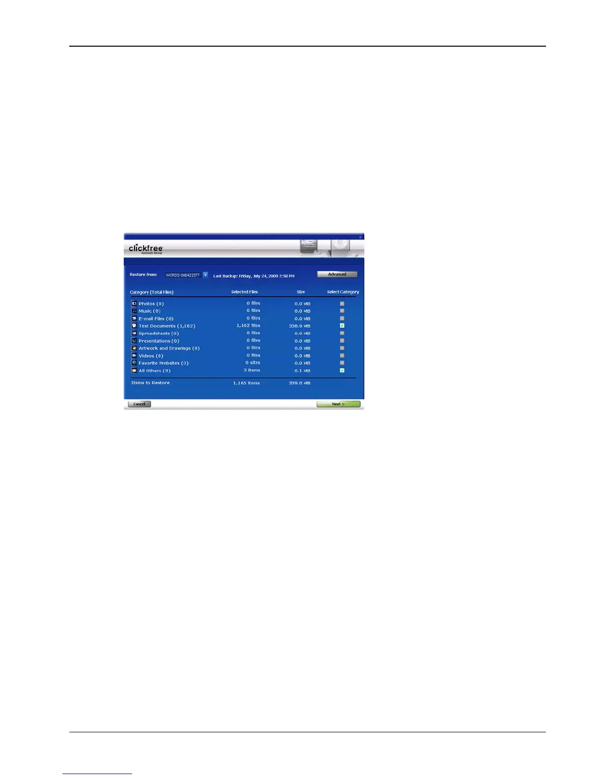 HOOSING CATEGORIES OF CONTENT TO BE RESTORED