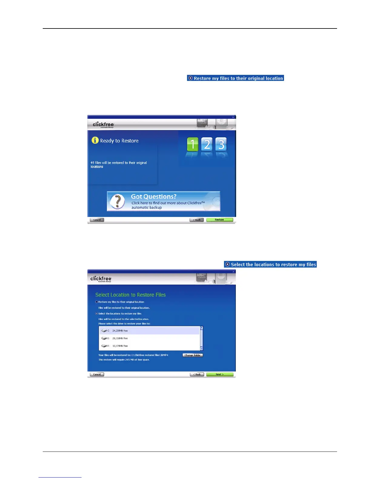 • If you want to restore your files to a location where they will not overwrite existing