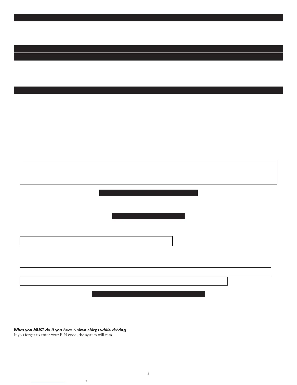 If you forget to enter your PIN code, the system will remind you 20 seconds after you begin driving by “chirping” the siren 5 times and flashing the LED.