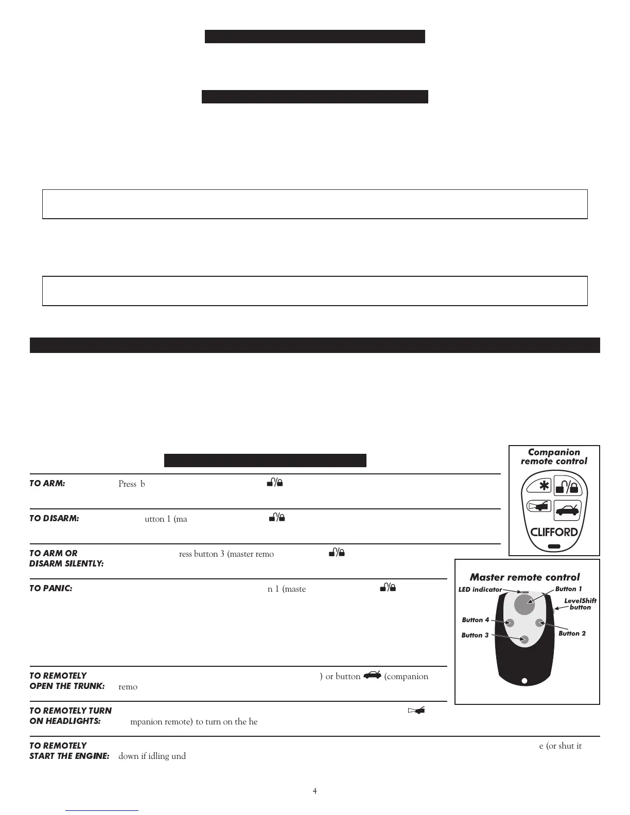 Press button 1 (master remote) or button (companion remote). Upon disarming: one chirp, one