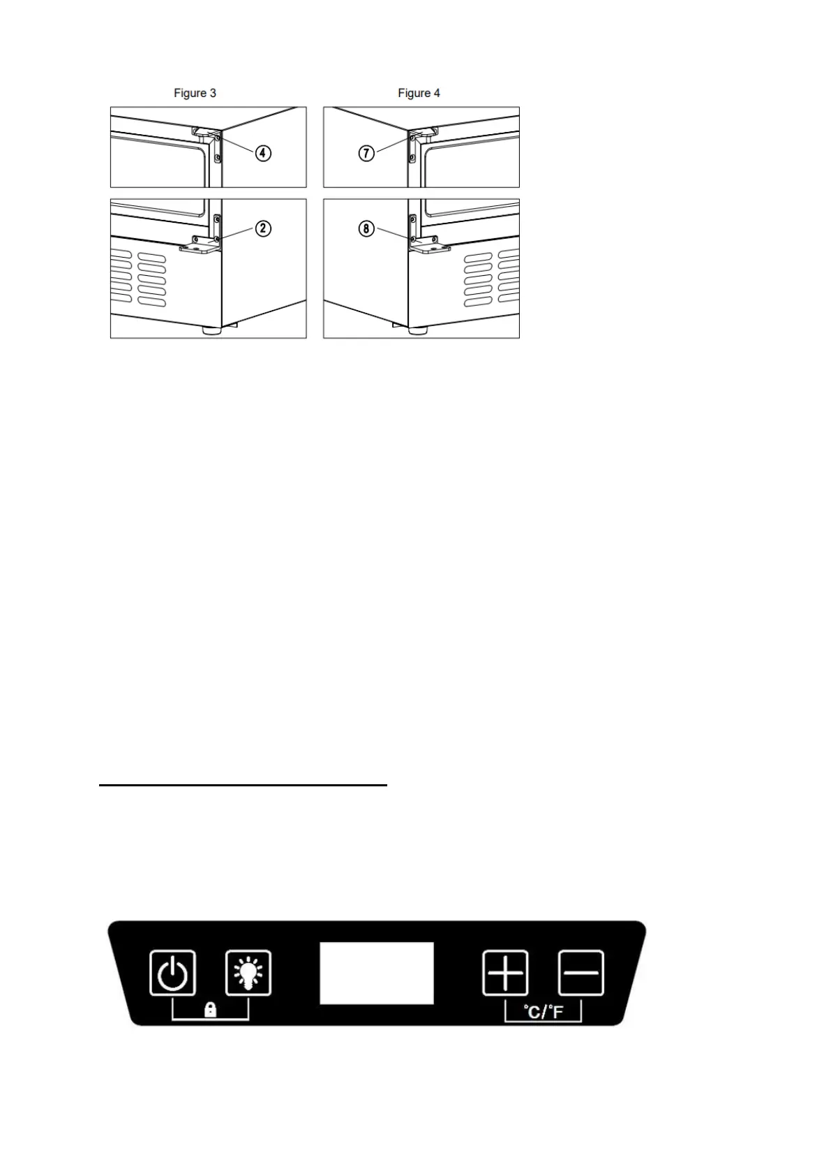 4) Install the upper left door hinge (7) and the lower left door hinge (8) in the box accessory bag at the