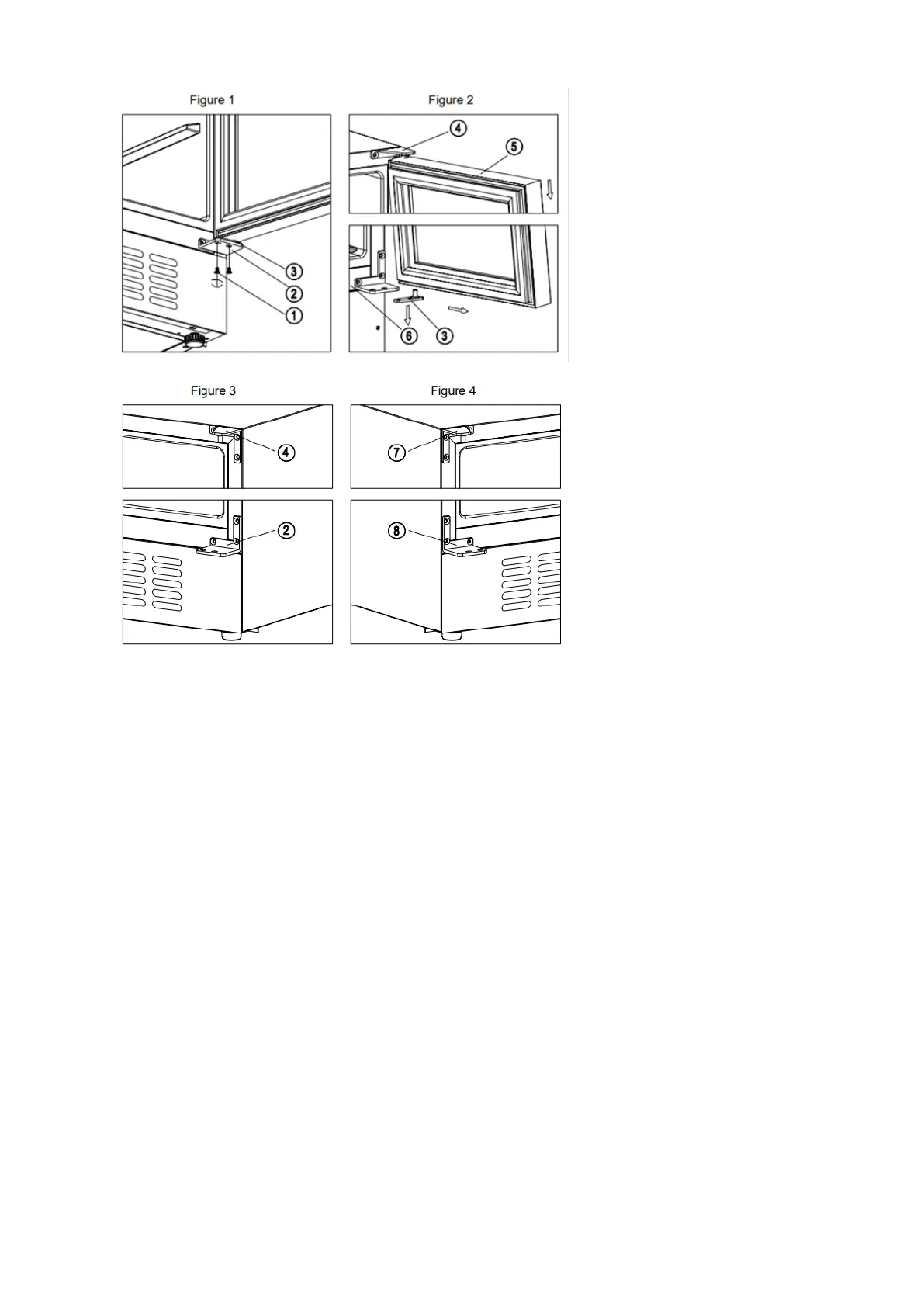4) Installeer het Linker Bovendeurscharnier (7) en het Linker Onderdeurscharnier (8) uit het