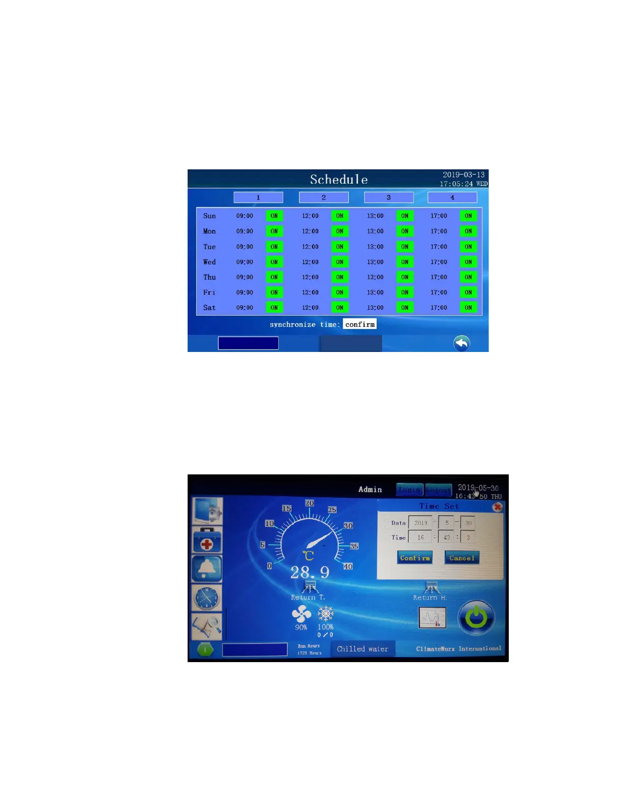 following screen: Touching the time will provoke a pop up to appear for changing the schedule