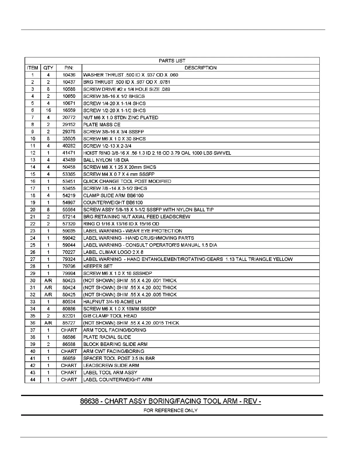 FIGURE 33. BORING/FACING TOOL ARM CHART ASSEMBLY PARTS LIST (P/N 86638)