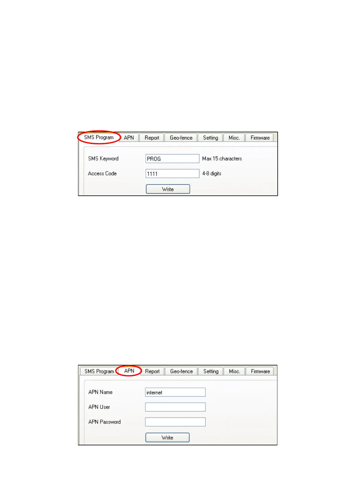 Click “APN” to set APN Name, APN User and APN Password and click “Write”