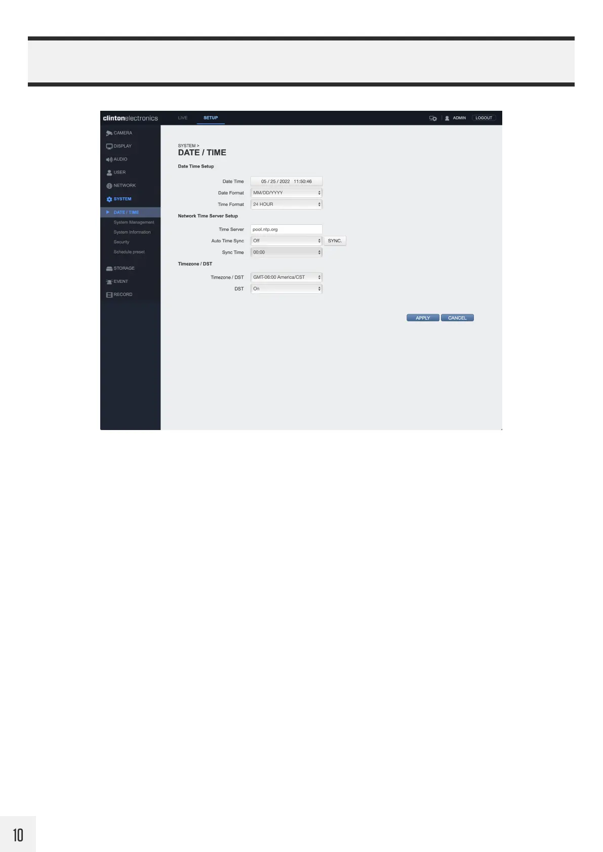 Click the APPLY button at the bottom of the page to save DATE/TIME changes.