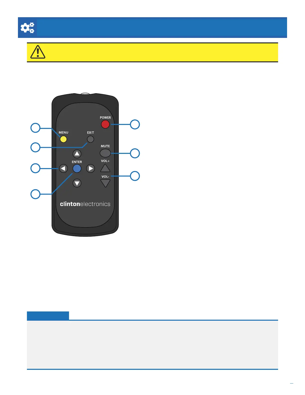 ATTENTION: The included remote is required to access the Main Menu and make any adjustments to