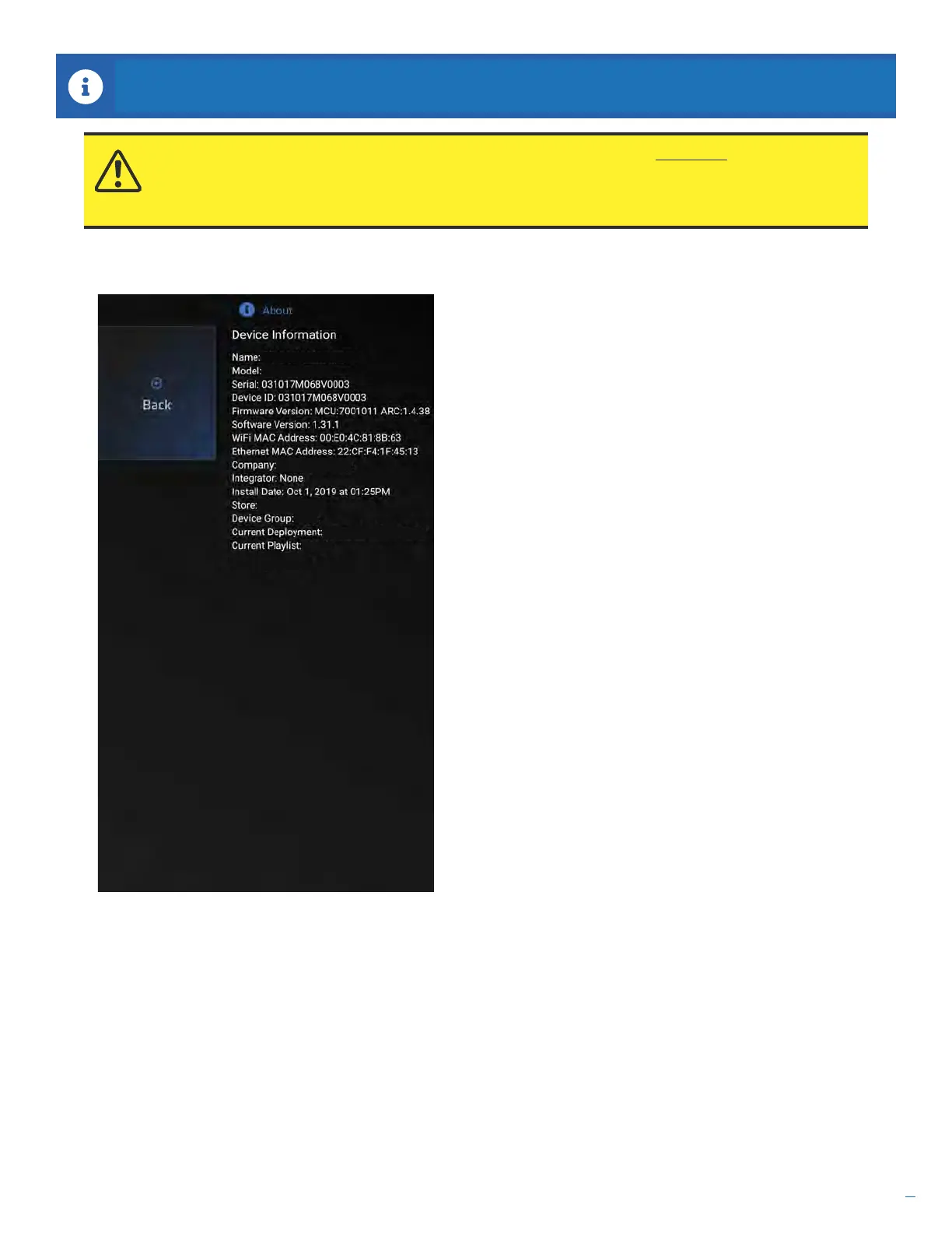 Press the MENU button on the remote to display the Main Menu, then select About. The About screen has basic