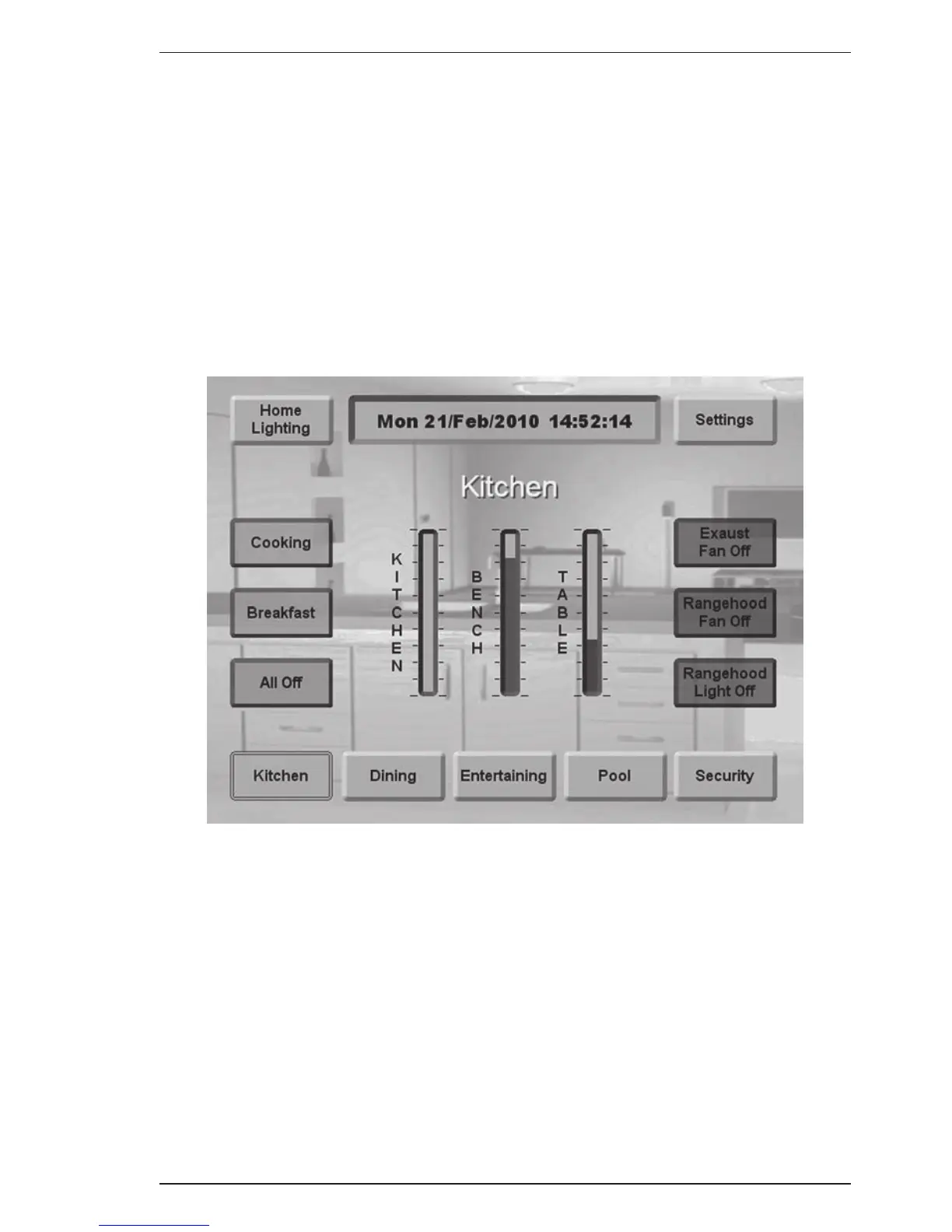 • Sliders that allow you to adjust (dim) specific lighting levels, by touching the