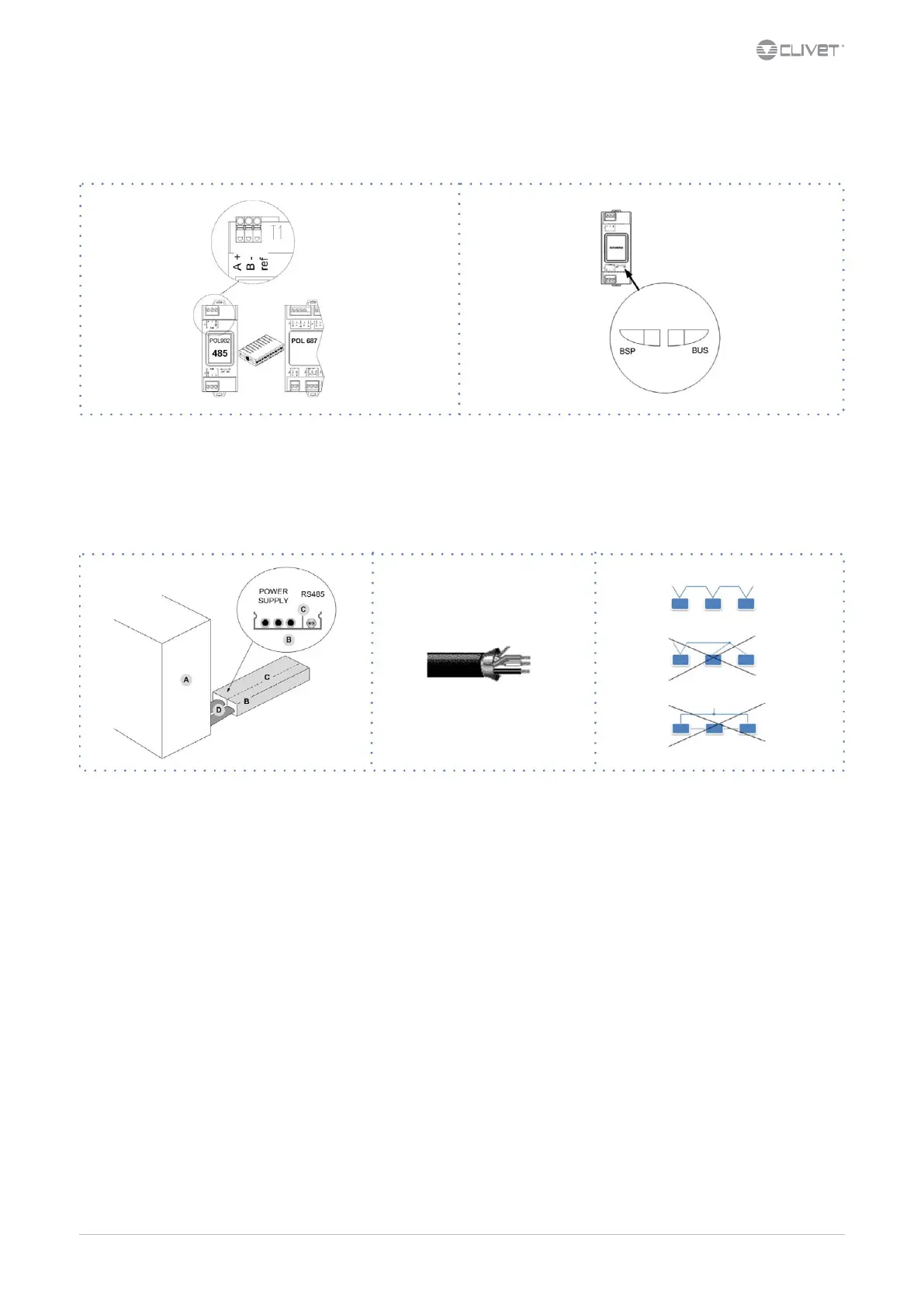 The RS485 serial line must be kept as far away as possible from sources of electromagnetic interference.
