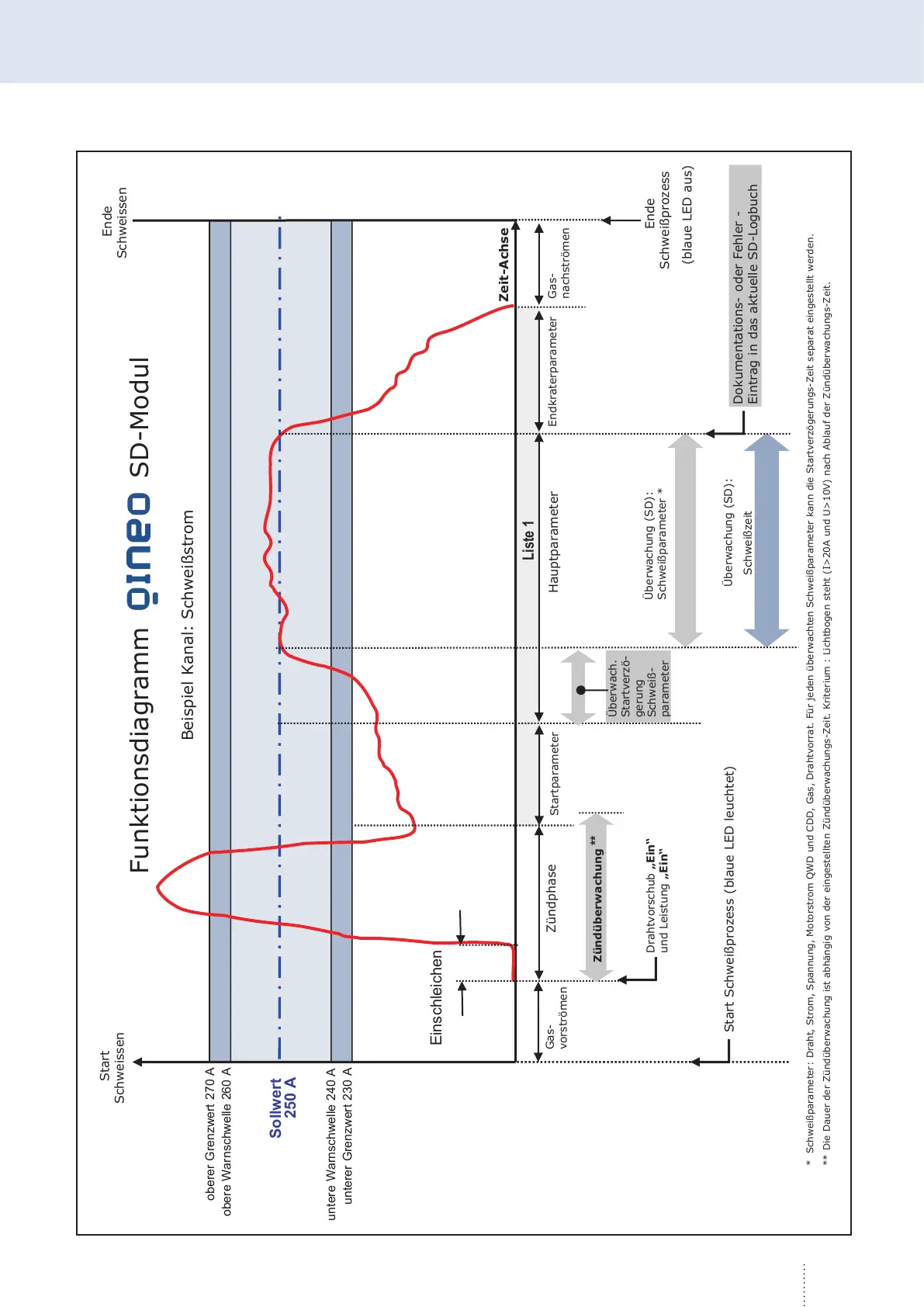 * Schweißparameter: Draht, Strom, Spannung, Motorstrom QWD und CDD, Gas, Drahtvorrat. Für jeden überwachten Schweißparameter kann die Startverzögerungs-Zeit separat eingestellt werden.
