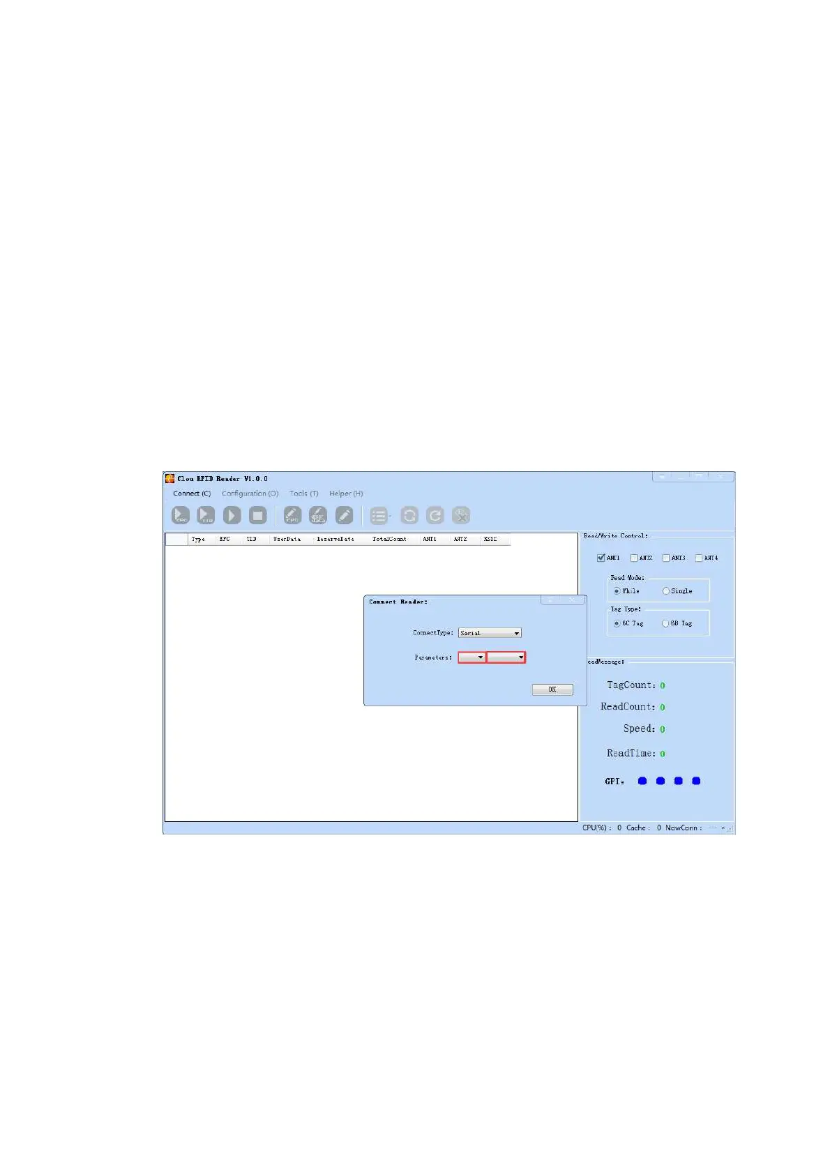 the icons on main UI are all in grey color, means reader is not connected. Select communication/connect