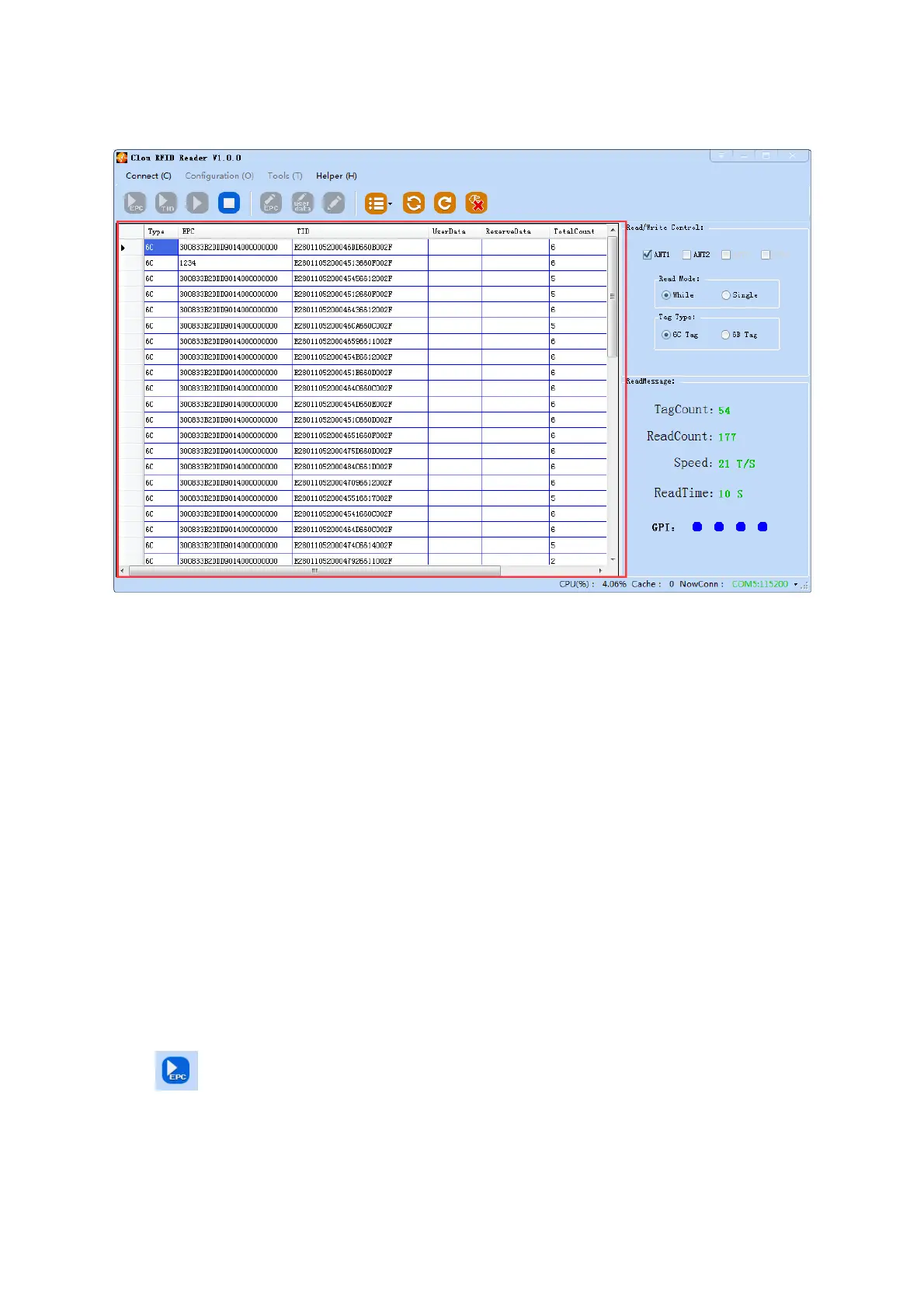 button, data display area will show read EPC data. Can support EPC length 240bits