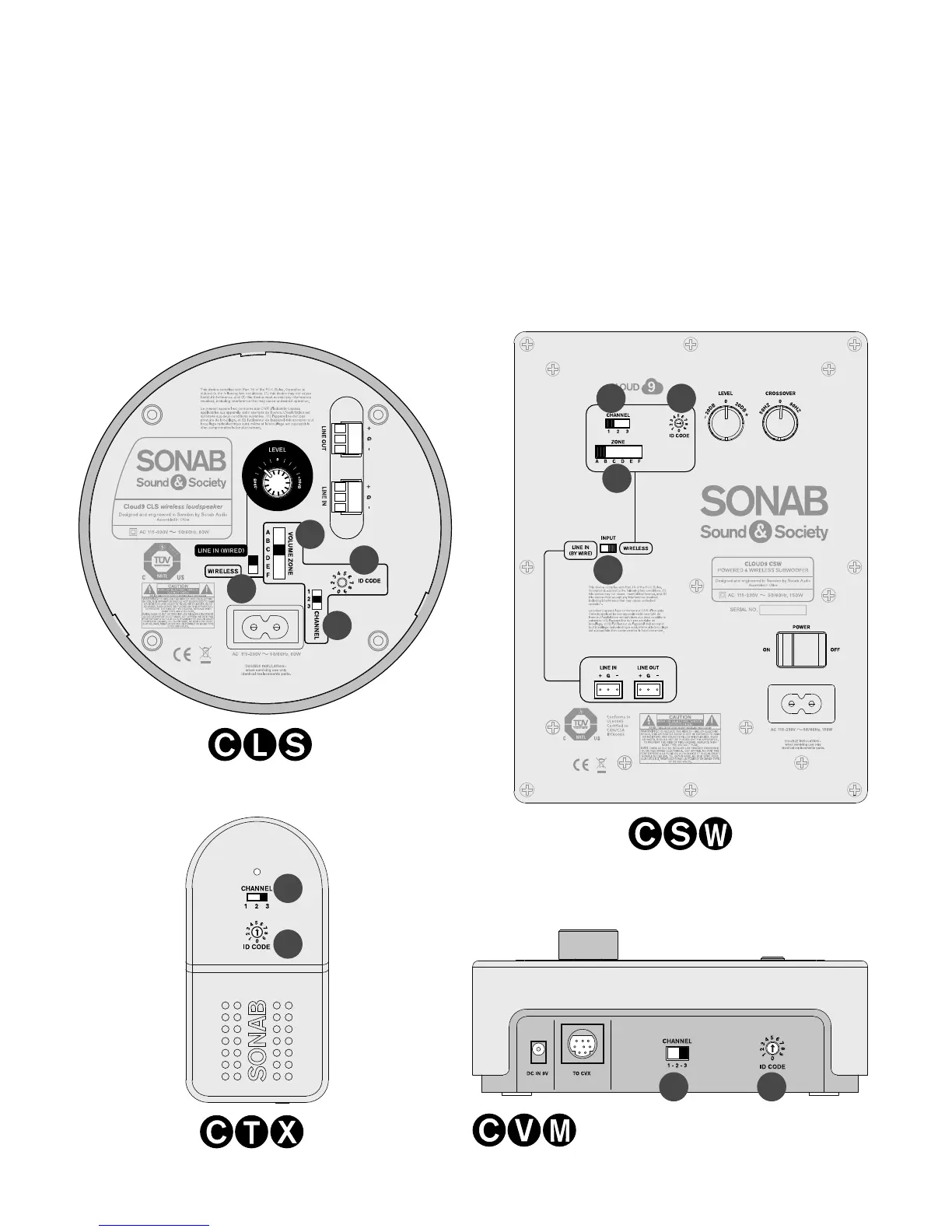Cloud-9 Sonab - Wireless Installation; Set all speakers to WIRELESS input; Set all units to same wireless Channel; Set all units to same ID code